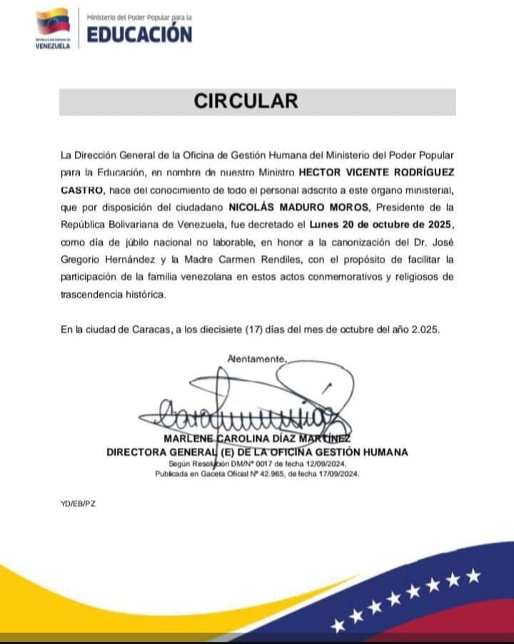 Informamos a toda la familia tirsiana que el próximo día lunes 20 e octubre del presente año no habrá actividades, ya que fue decretado como día de fiesta nacional en honor a la Canonización de nuestros beatos venezolanos hermana Carmen Rendiles y el Doctor José Gregorio Hernández, ya los podremos llamar los santos venezolanos.